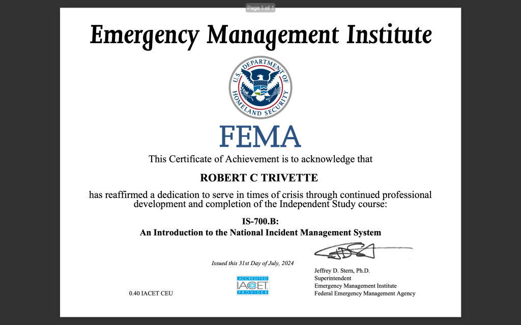 I have completed multiple FEMA Emergency Management Institute certifications focused on incident command, emergency response coordination, and national preparedness systems. These trainings strengthened my understanding of how public health, healthcare systems, and government agencies coordinate during emergencies, disasters, and large-scale public safety events. The coursework emphasized structured decision-making, interagency communication, and operational leadership within the National Incident Management System (NIMS).
